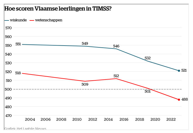 Europees kampioen voor wiskunde waren we toen Vlaanderen voor het eerst meedeed aan het TIMSS-onderzoek. Twintig jaar later zorgen de leerprestaties van onze tienjarigen voor woelige discussies, nu de resultaten bekend zijn van de proeven die 4336 leerlingen kinderen uit 146 scholen in 2023 hebben gemaakt. Voor wiskunde halen zij nu 521 punten op 1000. Een smak van 11 punten de diepte in tegenover vier jaar geleden. In 2019 had een gelijkaardige studie ons al uit de Europese kopgroep gewipt. Na de eerste terugval waren we al ingehaald door Nederland, nu dus ook door Duitsland. Enkel Frankrijk presteert minder goed.