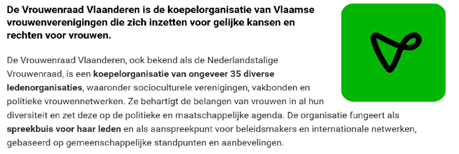 Vrouwenraad De Vrouwenraad is de belangrijkste koepelorganisatie van vrouwenverenigingen in Vlaanderen. Ze verenigt tientallen organisaties die werken rond vrouwenrechten en gelijke kansen. (Vrouwenraad) Wat ze doen: • verdedigen van gelijke rechten voor vrouwen • advies geven aan de overheid • acties rond thema’s zoals gendergelijkheid, geweld tegen vrouwen en arbeidsrechten • samenwerking tussen verschillende vrouwenorganisaties